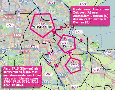 Heel Nederland, ook jouw regio is verdeeld in zones voor het openbaar vervoer. De centrumzones zijn speciaal bedoeld voor de ‘regio’ abonnementen om te bepalen binnen welke regio(s) men vrij kan reizen. Binnen de centrumzone die je kiest voor jouw abonnement kunt je vrij reizen. Dus bijvoorbeeld: Indien je een Randstad-Noord abonnement aanschaft met 1 ster met centrumzone 5715 (Diemen), dan kun je binnen Diemen wel vrij vrij reizen, maar niet binnen 5700 (Amsterdam).