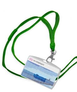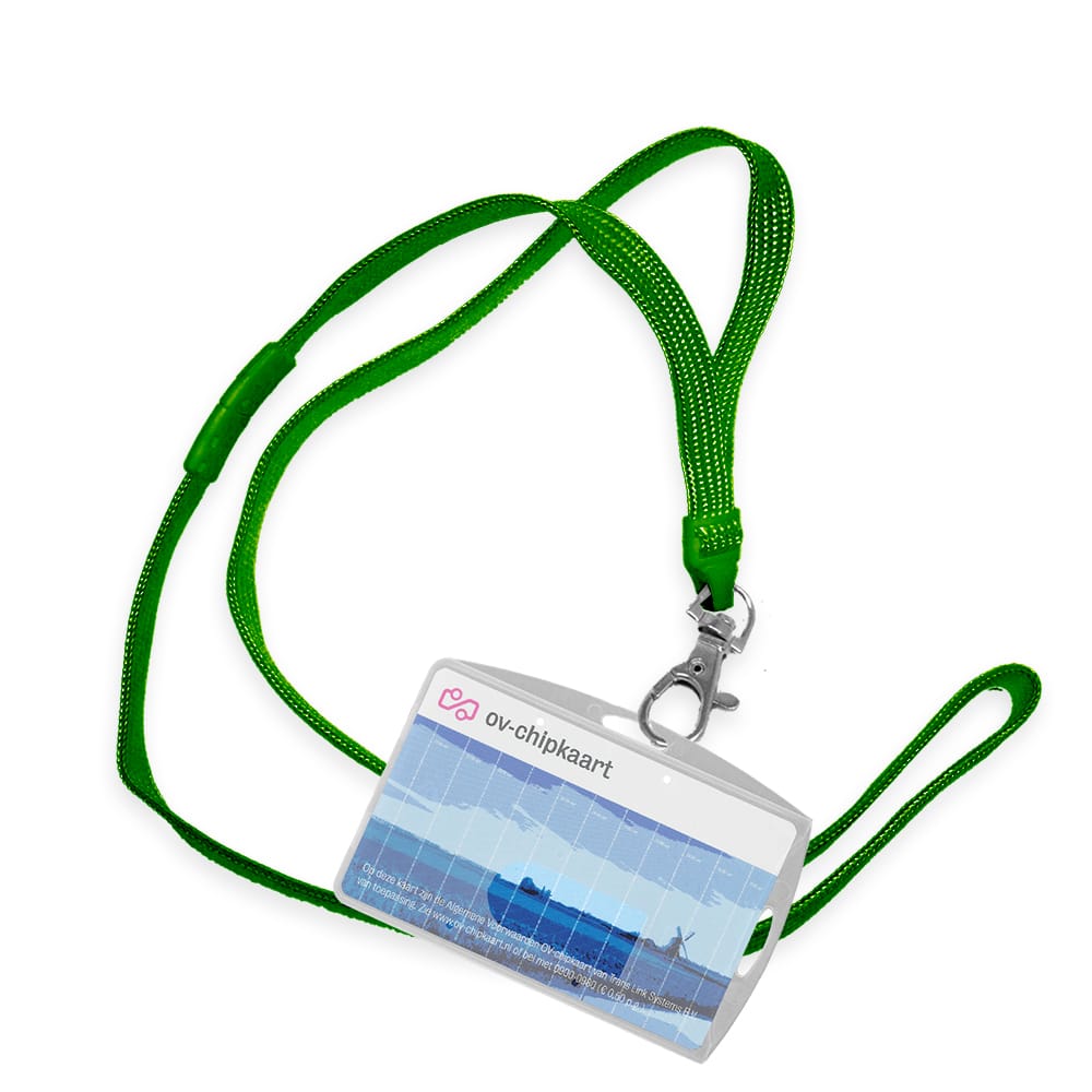 Dit draagkoord is groen van kleur en valt soepel om de nek. Het koord is van een sterk geweven duurzaam materiaal. Met een metaalkleurige haaksluiting haakt u snel en eenvoudig een OV-chipkaarthoesje vast aan het koord.