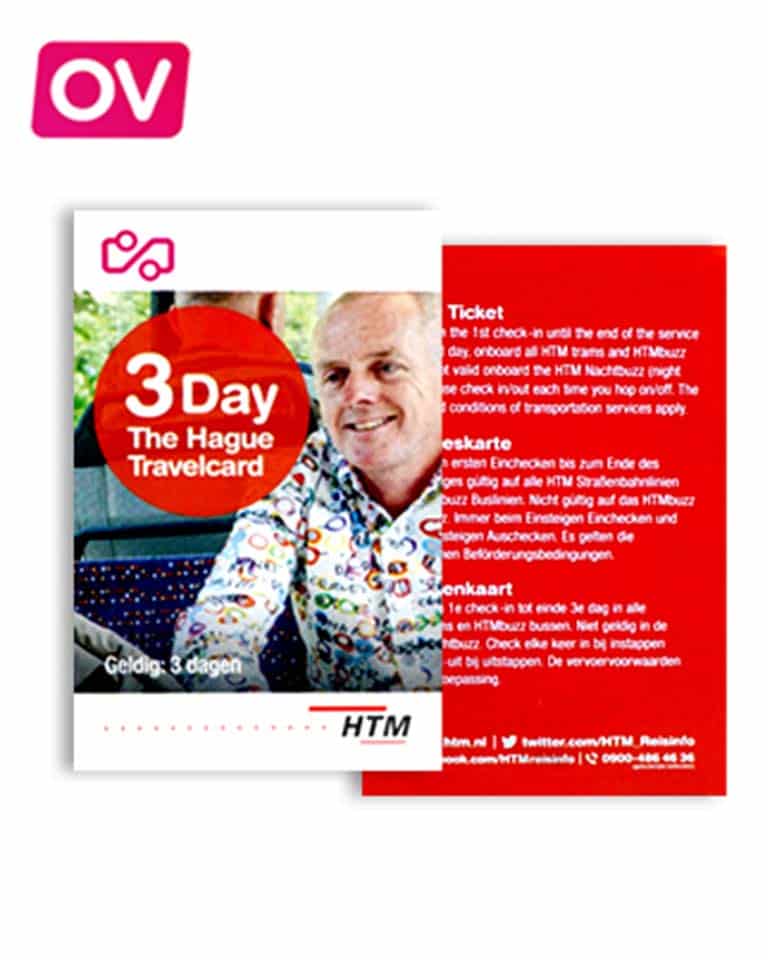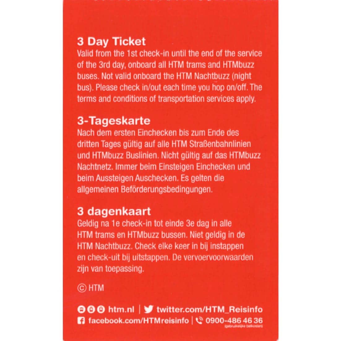 De HTM 3 dagenkaart verschaft je toegang tot het gebruik van alle vervoersdiensten van HTM. Let op: Je kunt met deze kaart alleen reizen met vervoerder HTM. Het kaartje is ideaal voor een weekendje weg of wanneer je meerdere dagen meerdere bestemmingen hebt in regio Den Haag, Zoetermeer en/of Delft.